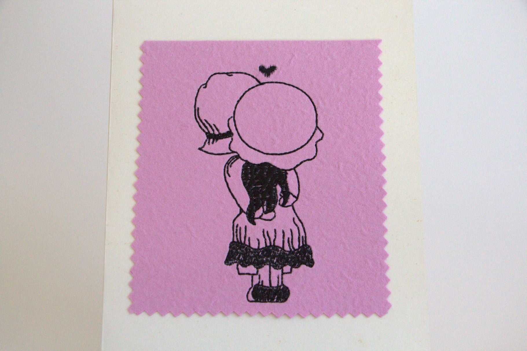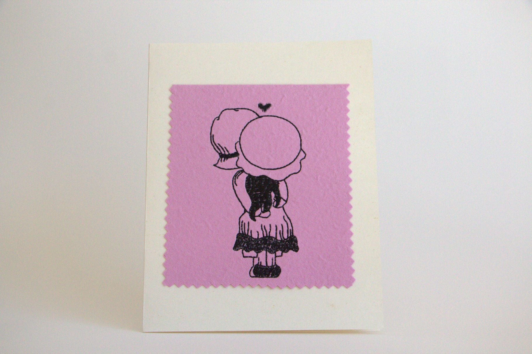 Celebrate the sweetness of love with this beautifully crafted, machine-embroidered greeting card. Featuring a nostalgic design of two figures sharing a tender kiss, it captures the innocence, warmth, and joy of heartfelt connection, a timeless reminder of the special bond you share.