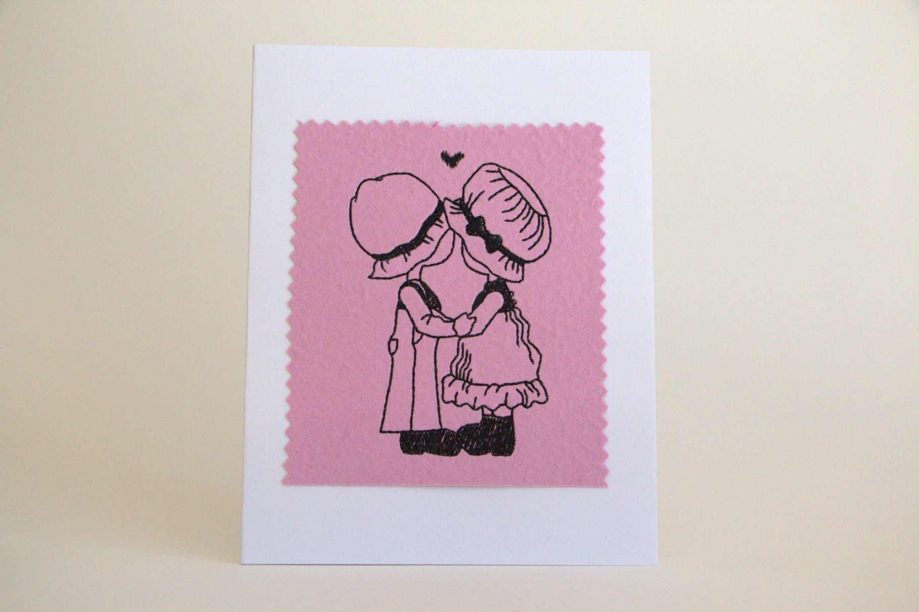 Celebrate the joy of love with this beautifully crafted, machine-embroidered greeting card. Featuring a charming, nostalgic design of two figures sharing a tender kiss, it captures the innocence, warmth, and closeness that make love so special.
