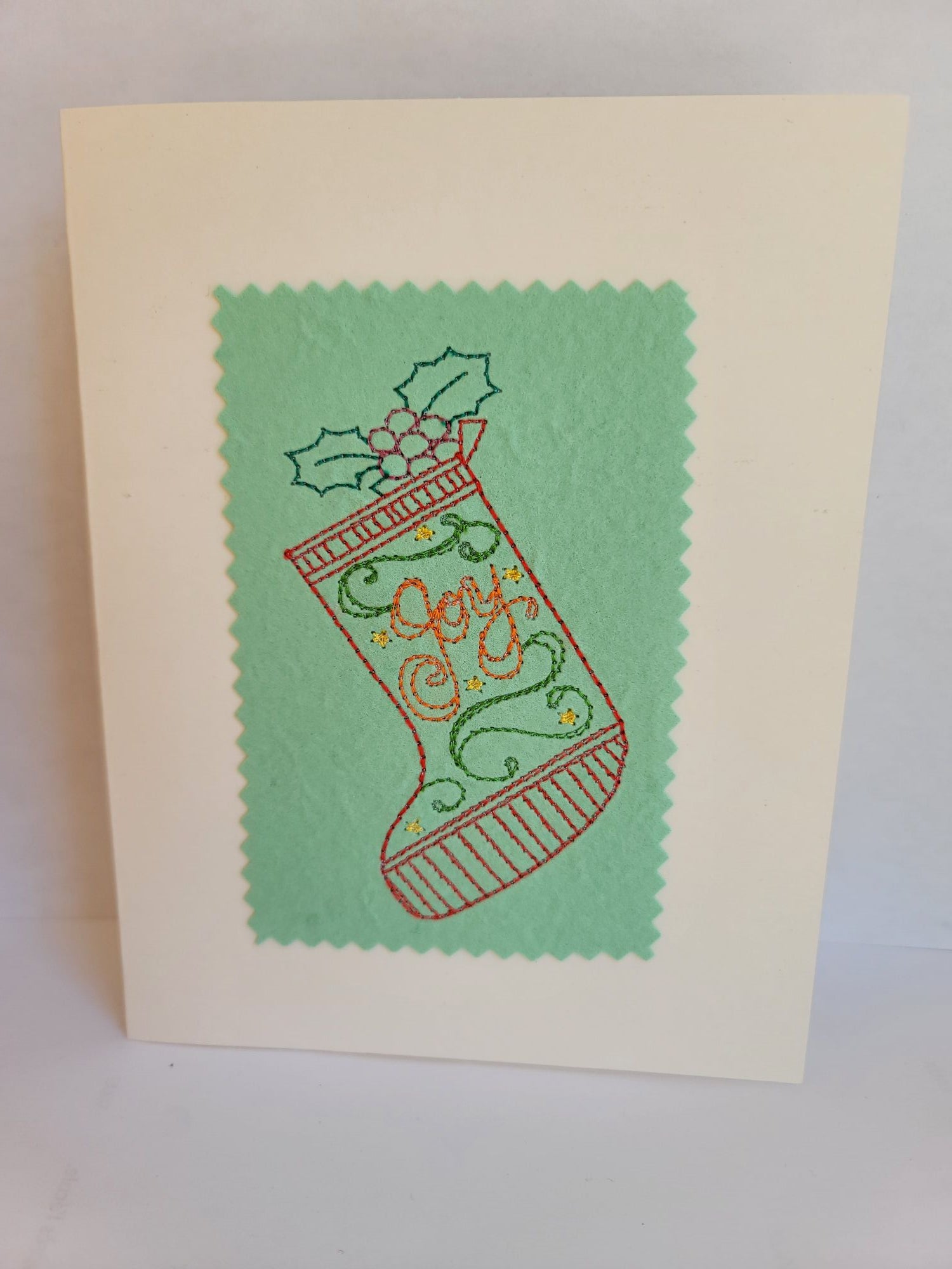 Share the magic of the holidays with this charming, machine-embroidered greeting card. Featuring a festive Christmas stocking adorned with holly leaves, berries, and swirling golden accents, it captures the joy, warmth, and anticipation of the season. The intricate stitching on soft green fabric evokes cozy holiday traditions and the delight of giving from the heart.