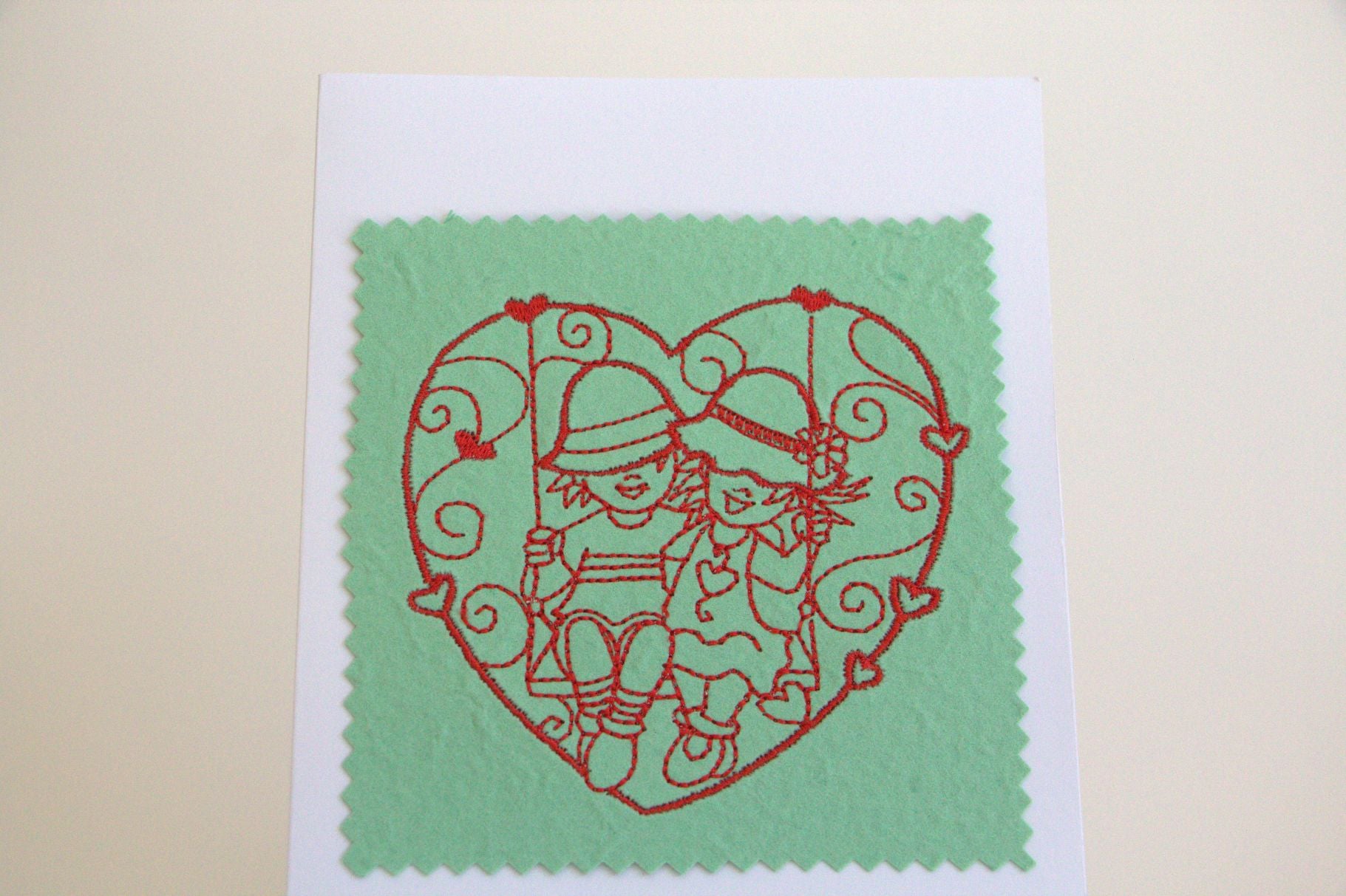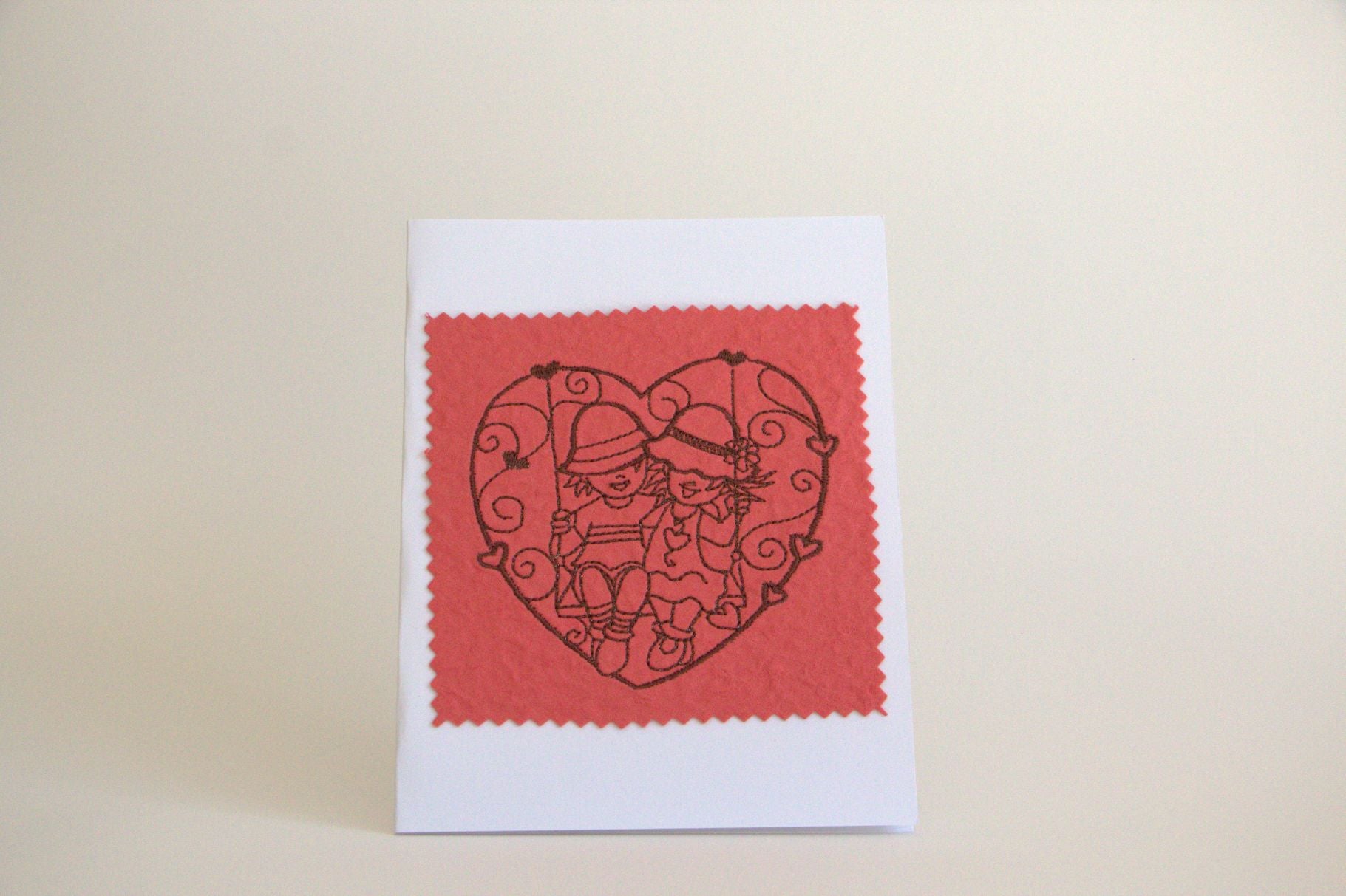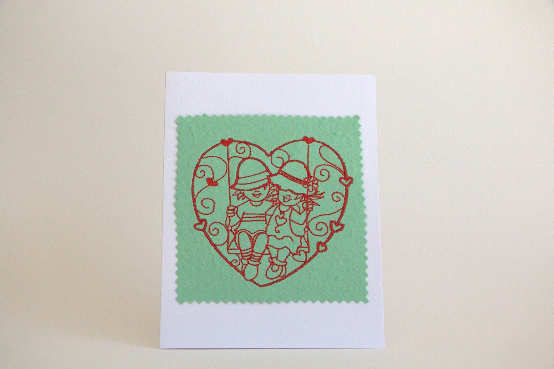 Celebrate the joy of togetherness with this beautifully crafted, machine-embroidered greeting card. Featuring a heartwarming design of two figures sharing a playful moment on a swing, it captures the innocence, happiness, and sweetness of love — a timeless tribute to the special bond you share.